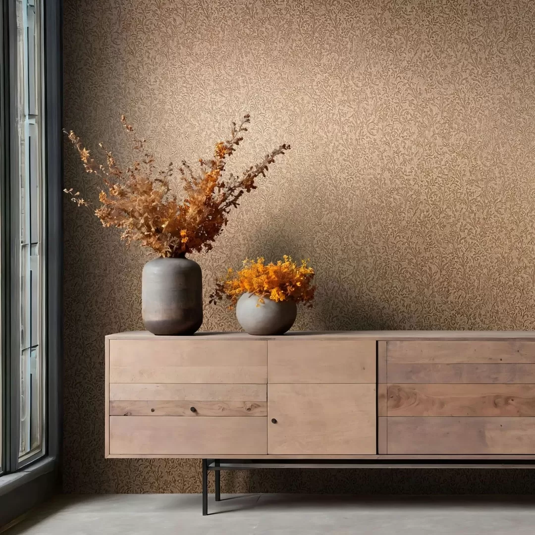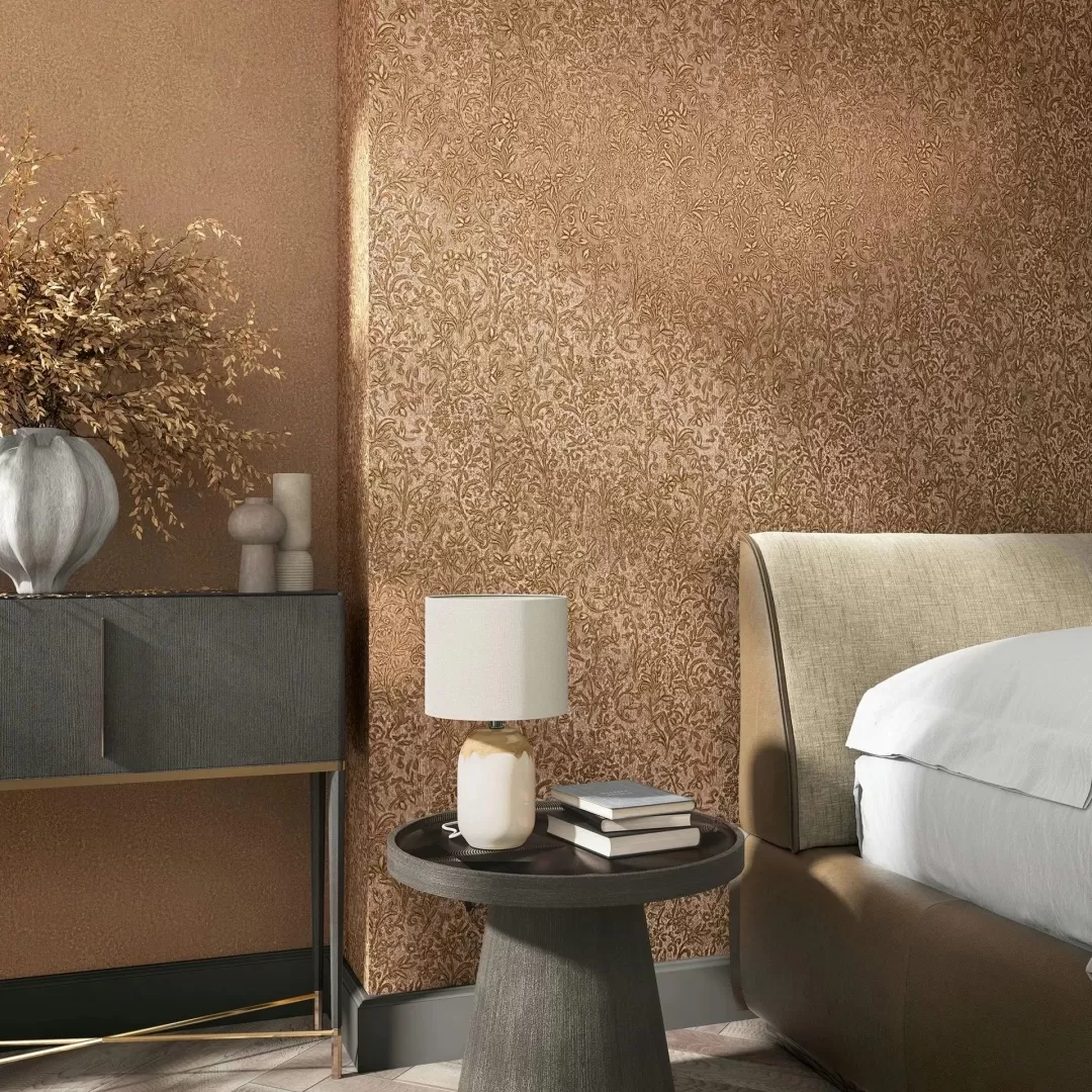Give your walls a touch of vintage romance: this wallpaper combines a delicate floral relief with elegant gold accents on a patinated background. Ideal for stylish interior design with classical elegance and artistic character.